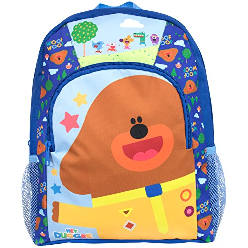 Hey Duggee Kids Hey Duggee Backpack has the following specifications Children's Hey Duggee Backpack. Your little pooch will be ready for discovery and adventure every day when kitted with this Woof-tacular backpack! Featuring a vibrant design of the charming dog and leader of the Squirrel Club Duggee, surrounded by a motif of trees, clouds and the words 'Woof Woof' this rucksack is perfect for those who adore the popular Cbeebies show. This bag has a zipped main compartment, a front pocket and two mesh side pockets so your little one can head off to adventures with the Squirrel Club greatly equipped.