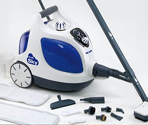 Palson Sky Plus Steam Cleaner 10 in 1 with Accessories, Extra long 5M Cord, 3.5 Bar - Free 2 Year Warranty has the following specifications Color: blanco/azul Alto poder desincrustante a alta temperatura. Depósito de agua de gran capacidad: 1,6 litros. Alta presión de vapor: 4 bar. Depósito de jabón de 250 ml. con dosificación automática, que además de limpieza consigue desinfección. Ruedas de goma que facilitan su transporte. Cable extra largo de 5 metros. Triple sistema de seguridad. Luz indicadora de funcionamiento. Equipada con múltiples accesorios para diferentes superficies.