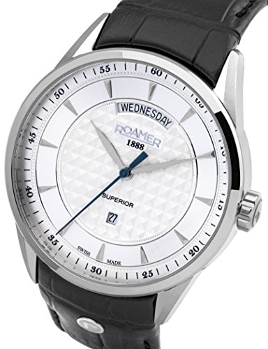 Roamer Men's Quartz Watch with Silver Dial Analogue Display and Black Leather Strap 508293 41 15 05 has the following specifications This handsome men's Roamer Superior Day Date watch has a stainless steel case and is powered by a quartz movement. It fastens a black leather strap and has a white dial. The watch has a date function.
